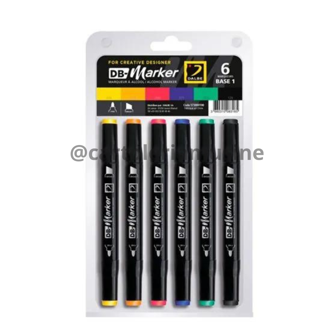 Set di Pennarelli doppia punta: punta fine e punta a scalpello . Pennarelli ad alcool, ideali per  disegni, schizzi, illustrazioni, design, rendering, fumetti, manga, scritte, sottolineature di poster e altre forme di design.Set da 6 Base 1: 034 Giallo - 024 Giallo Oro - 005 Papavero - 071 Blu Royal - 055 Verde Brillante - 120 Nero