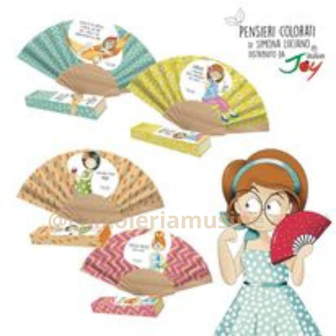 Ventaglio in bambù e tessuto. Porta con te la simpatica ( e pungente ) ironia dei pensieri colorati di SIMONA LUCIANO. Le signorine sono ironiche, dolci e un po' goffe, ma nascono dall'allegria e dalla spensieratezza dell'autrice. Sono sagge, qualche volta impertinenti, rispecchiano la vita di tutti i giorni. Da qui nascono i pensieri colorati. Se le giornate non ci sorridono, noi facciamogli il solletico e pensiamo colorato! CERCASI FRESCO ANCHE USATO! DIMENSIONI: Apertura di 44 cm, Chiuso h 21 cm Ventaglio in bambù e tessuto Scatola regalo 16,90€VENTAGLIO Pensieri colorati SITUAZIONE ATTUALE..