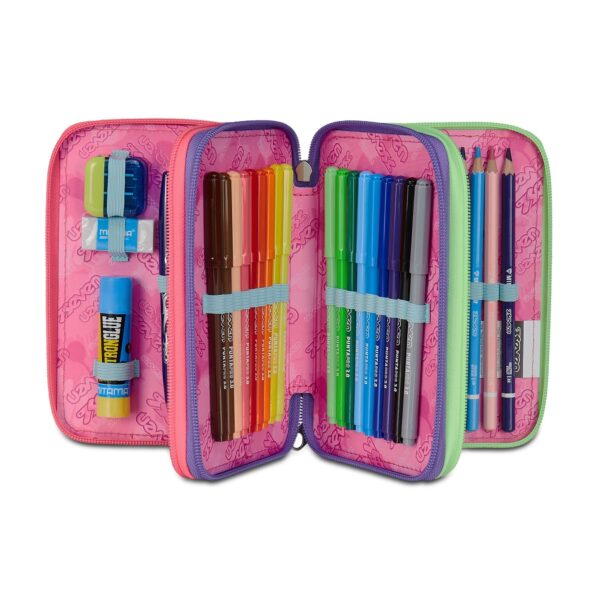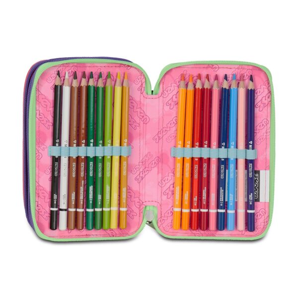 La struttura a tre zip permette di organizzare con precisione penne, matite, colori e accessori. Ogni scomparto è indipendente e consente di mantenere ordine e praticità nello zaino.