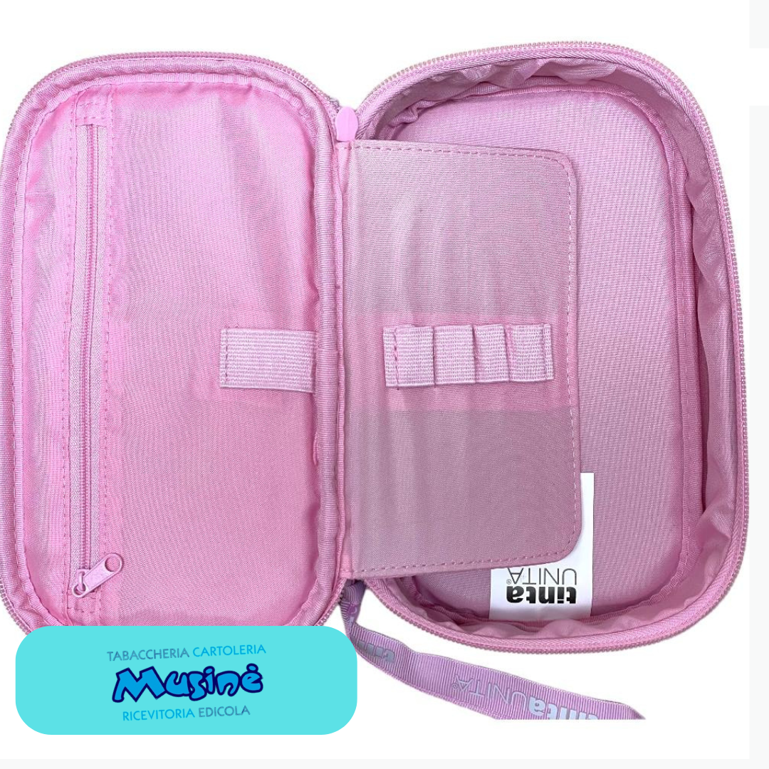 Astuccio Ovale Jumbo della nuova linea scuola TintaUnita Young Glamour ” 2024/2025 per cancelleria, con chiusura a zip ed all’interno organizer con elastici per penne e matita, tasca interna con zip ed elastico per colla o righello.