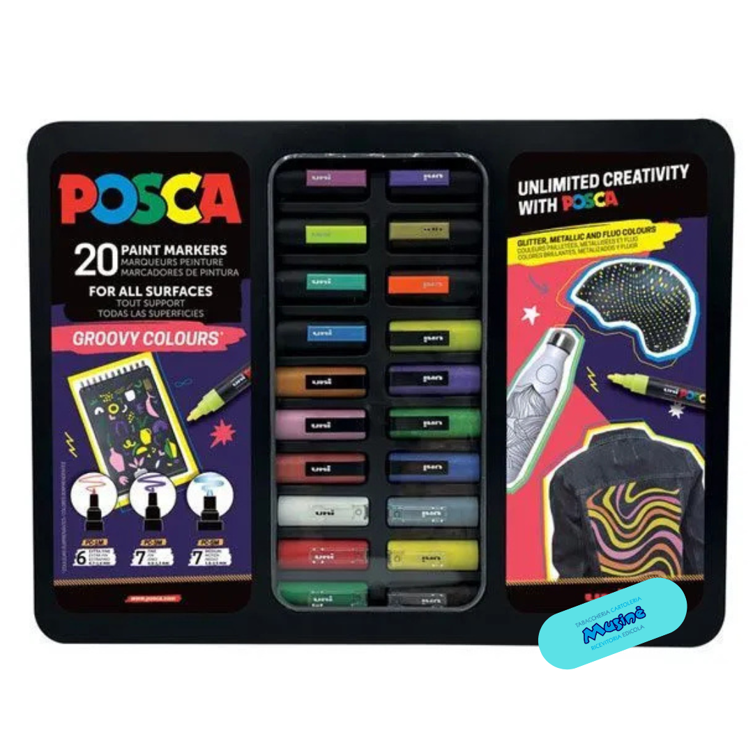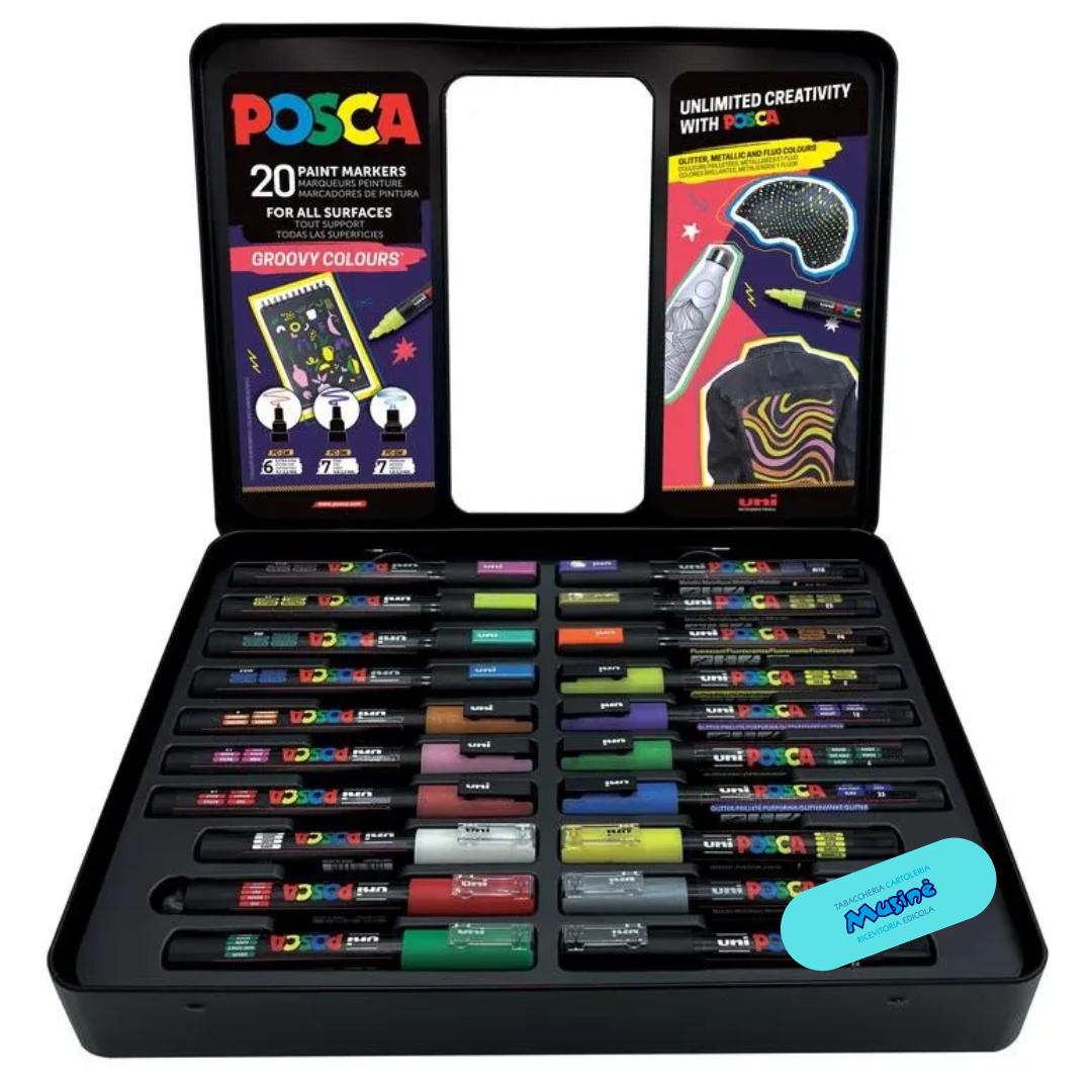 Scopri la scatola di 20 pennarelli UNI-POSCA Pop Groovy Colours da 20 pezzi di Uni-Ball, ideale per dare vita ai tuoi progetti creativi. Questi pennarelli con inchiostro impermeabile, offrono colori vivaci e opachi che aderiscono a una varietà di superfici, dal legno al vetro.