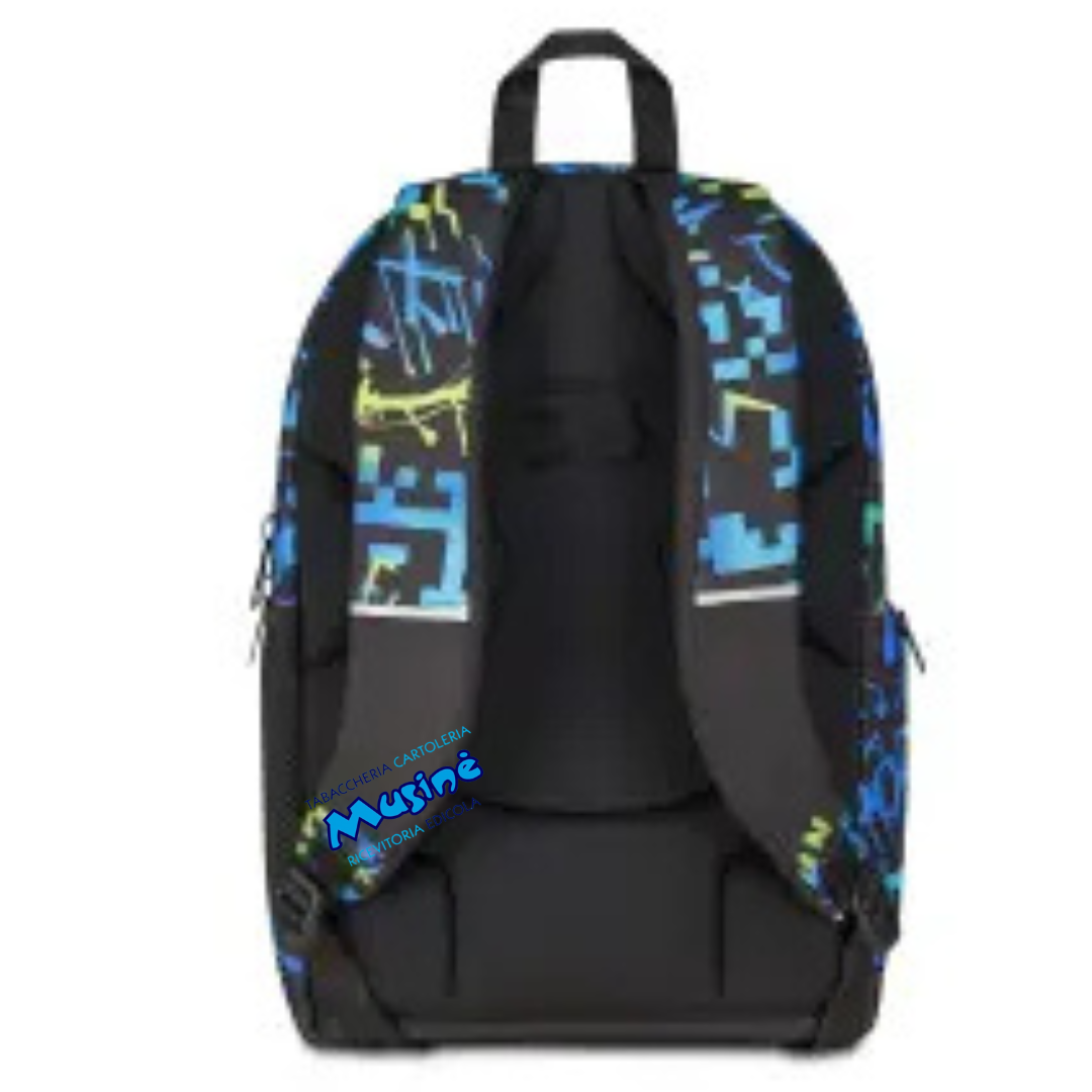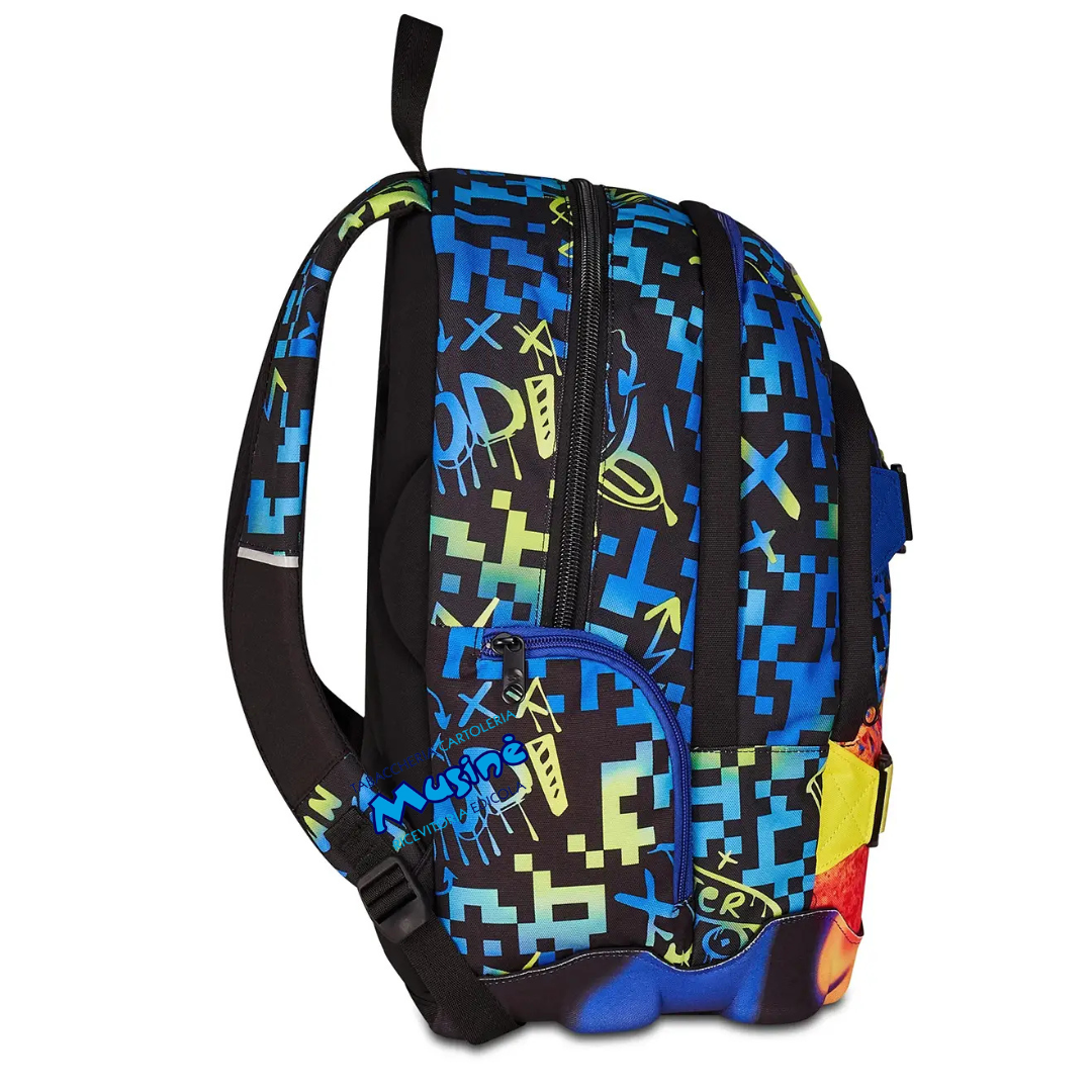 La fantasia Scribbled Flame si distingue per le sue grafiche creative e colorate, con un tocco flame che cattura subito l’attenzione, rendendo lo zaino perfetto per ragazzi che amano distinguersi anche a scuola.